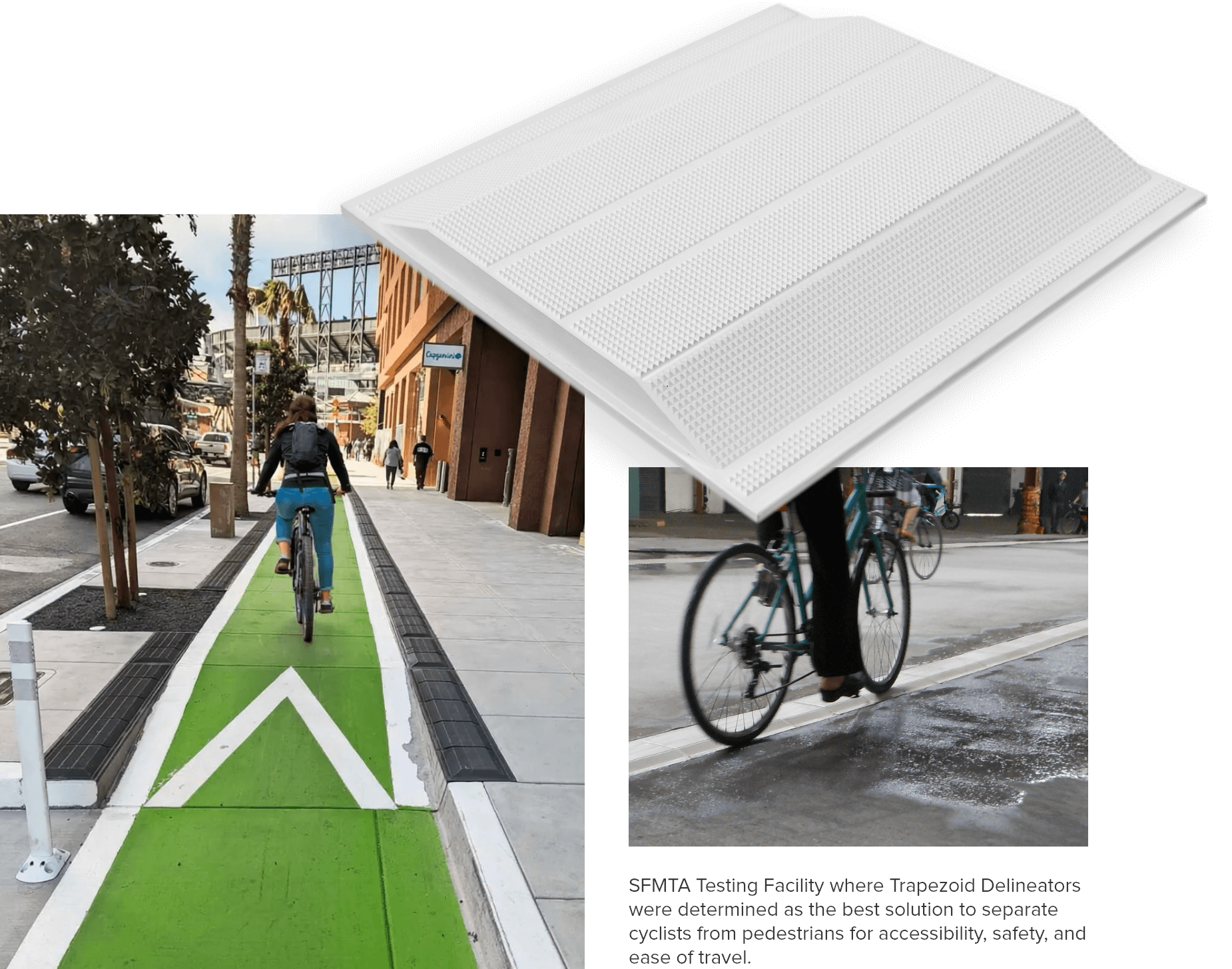 TekWay® Trapezoid Delineators, recognized in NACTO’s bike-path design guidance, are engineered surface tiles that provide a tactile and visual “border” to clearly define separate areas for cyclists and pedestrians on sidewalk-level pathways, without compromising accessibility.