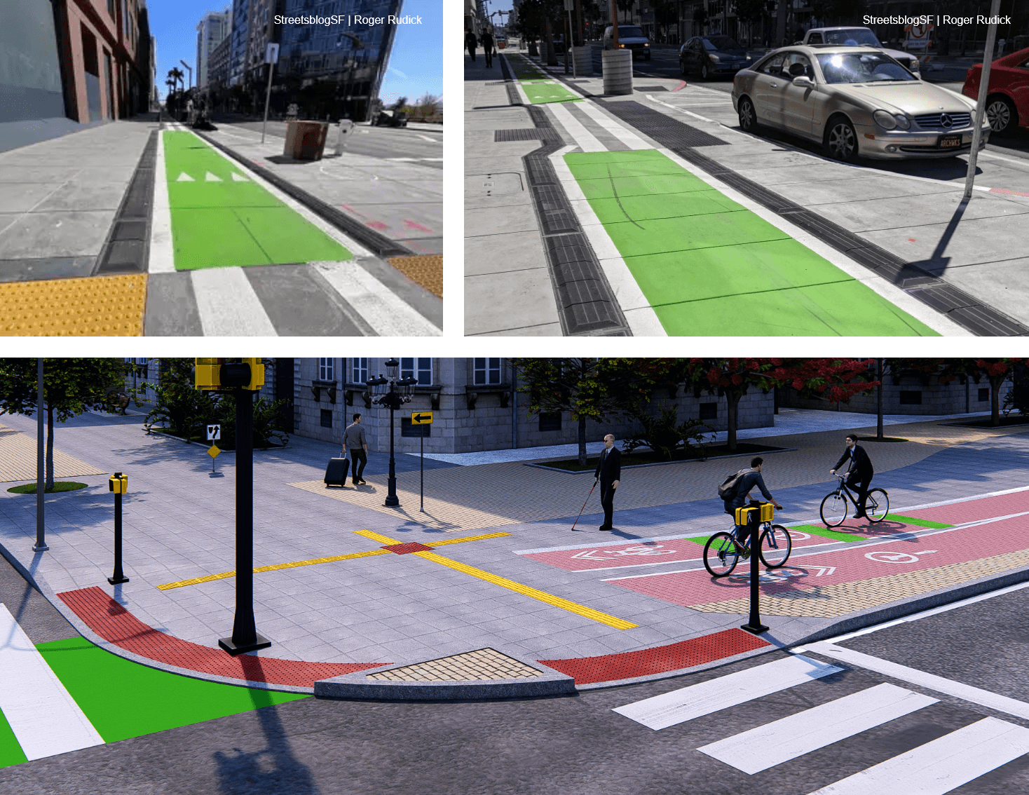 Sidewalk-level bike paths physically separate riders from fast-moving traffic while using design elements—like delineators—to maintain safe, accessible pathways for all.
